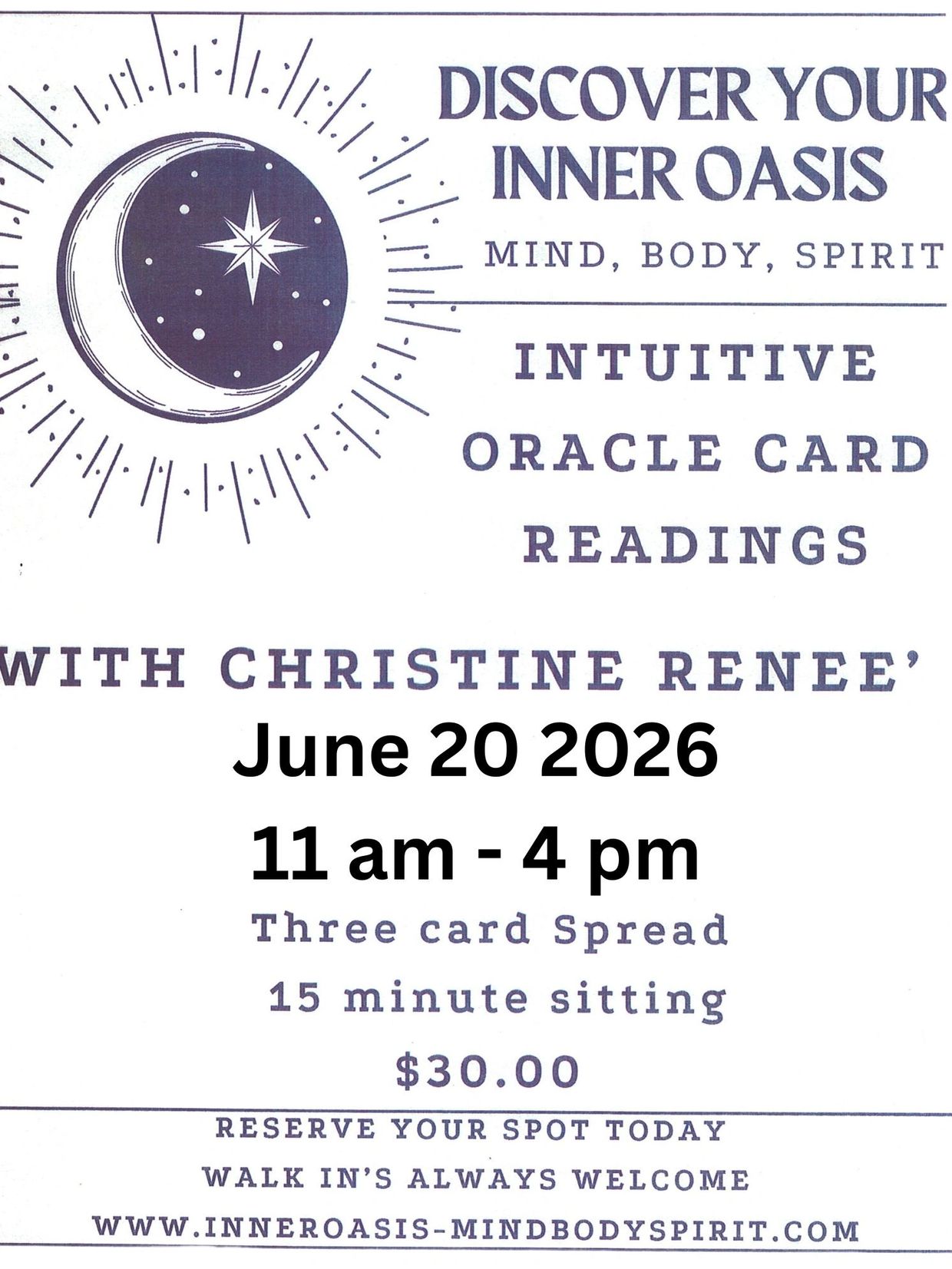 Christine has been reading at Inner Oasis to assist those lead to her to find their inner path, providing clarifying insight on our journeys to balance our Mind's, Bodies, and Spirits.