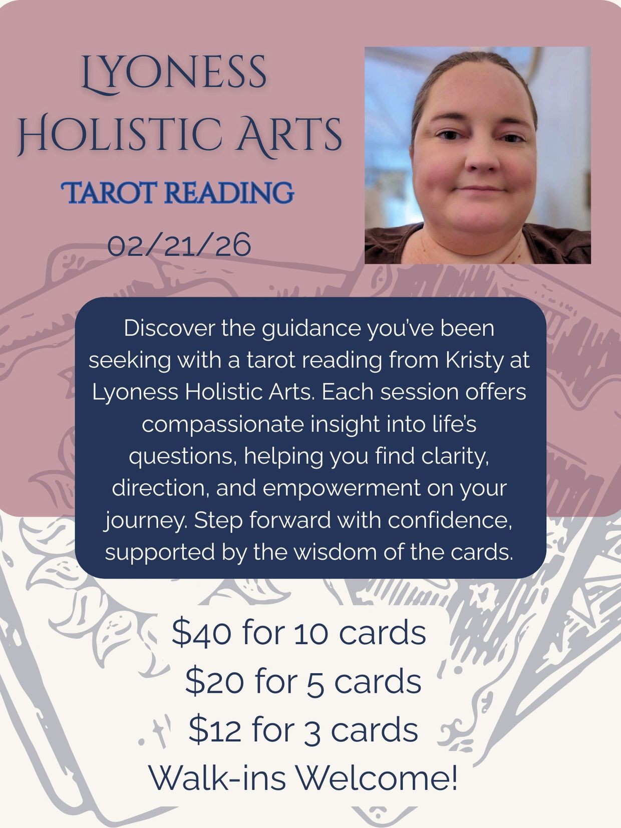 Discover the guidance you’ve been seeking with a tarot reading from Kristy at Lyoness Holistic Arts. Each session offers compassionate insight into life’s questions, helping you find clarity, direction, and empowerment on your journey. Step forward with confidence, supported by the wisdom of the cards.