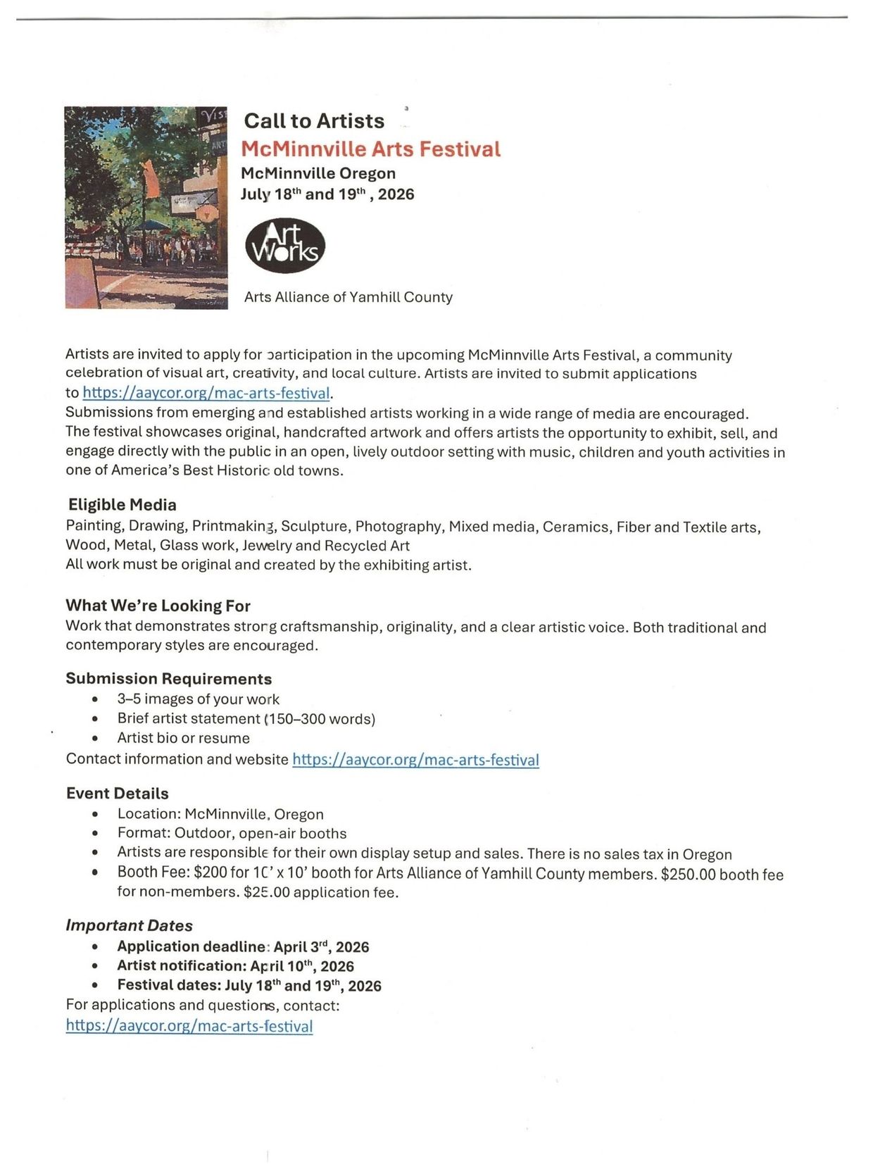 Artists are invited to apply for participation in the upcoming McMinnville Arts Festival, a community celebration of visual art, creativity, and local culture.